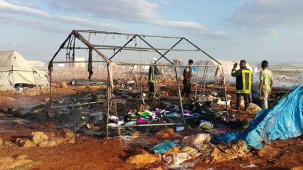 پناہ گزیں کیمپ پر ہونے والے فضائی حملے میں کم سے کم 30 افراد ہلاک اور درجنوں زخمی ہو گئے ہیں۔اس کیمپ میں زیادہ تر وہ لوگ آباد ہیں جو حلب سے نقل مکانی کر کے آئے تھے۔ امریکی وائٹ ہاؤس کے ترجمان نے اس حملے کی مذمت کرتے ہوئے کہا ہے کہ پہلے سے لڑائی سے جان بچا کر آنے والے معصوم شہریوں پر حملے کا کوئی جواز نہیں۔ سوشل میڈیا پر جاری کی جانے والی تصاویر میں دیکھا جا سکتا ہے کہ ترکی کی سرحد کے قریب قائم کمونہ کیمپ میں پناہ گزینوں کے خیمے تباہ ہو چکے ہیں۔ بعض اطلاعات کے مطابق یہ حملہ شامی یا روسی جنگی طیاروں نے کیا ہے لیکن ابھی اس کی تصدیق نہیں ہوئی۔ یہ حملہ شام میں جنگ بندی کی توسیع کے محض ایک دن بعد کیا گیا ہے۔