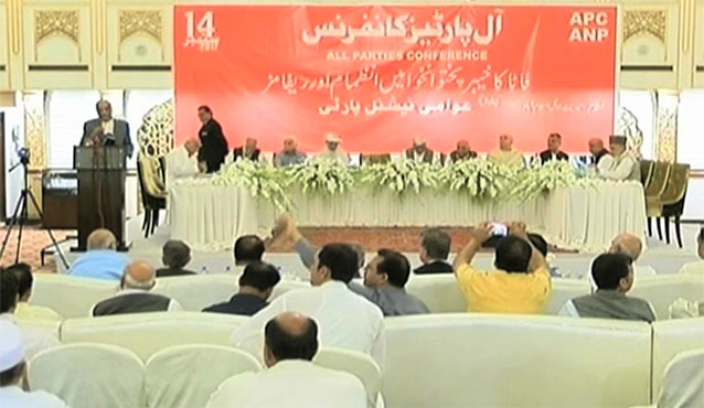 اسلام آباد: فاٹا اصلاحات پر عوامی نیشنل پارٹی کے زیراہتمام کل جماعتی کانفرنس کا انعقاد ہوا۔ قبائلی علاقہ جات کے فوری کے پی میں انضمام اور ایف سی آر کے خاتمے کا مطالبہ کیا گیا۔ قبائل کے عوامی اور جمہوری حقوق کی حمایت کی گئی۔