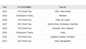 ویب سائٹ کے مطابق بھارت 2024 سے 2031 تک جن اہم ایونٹس کی میزبانی کرے گا ان میں دو ورلڈکپ اور چیمپئنز ٹرافی شامل ہے۔
