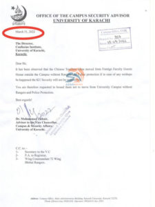 جامعہ کراچی کی جانب سے رینجرز حکام کو بھی اس حوالے سے آگاہ کیا گیا تھا،خط میں لکھا گیا ہے کہ چائنیز آفیشل بغیر رینجرز اور پولیس سیکیورٹی کے نقل حرکت کررہے ہیں، کسی بھی ناخوشگوار واقعہ کے سبب جامعہ کراچی زمہ دار نہیں ہوگی ، چائنیز آفیشل کو بغیر سیکیورٹی کے نقل و حرکت پر روکا جائے۔ جامعہ کراچی نے خط اکتیس مارچ کو کنفیوشس ڈیپارٹمنٹ اور سیکیورٹی اداروں کو بھیجا تھا