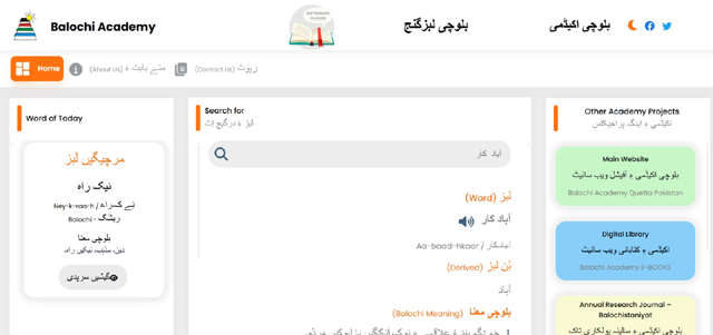 کوئٹہ : بلوچی  اکیڈمی  ءَ  بلوچی زبان ءِ ڈیجیٹائز کنگ ءِ کاراں گیشی آراں  بلوچی زبان ءِ مستریں   لبز بلد  ’’لبزگنج‘‘   ءِ نام ءَ آن لائن  شِنگ کُتَگ۔  اے ڈکشنری  ءَ  چِلّ ہزار  ءَ گیش  بلوچی لبز ءُ آہانی معنا،  بلوچی ءِ لبزانی  انگریزی، اُردو ءُ براہوئی معنا   ہوار اَنت۔ لبزگنج     ڈیجیٹل ڈکشنری    بلوچی اکیڈمی ءِ پراجیکٹ  این ایل پی بلوچی  ءِ چیردستی ءَ  جوڑ کنگ بُوتگ۔ ڈکشنری ءِ اے کار  2023 ءَ بندات کنگ بُوتگ ءُ  ڈکشنری اولی  ورژن   سرجم کَنَگ ءُ   آن لائن شِنگ کنگ بُوئگ ءَ اِنت۔