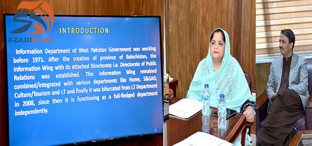 کوئٹہ: پارلیمانی سیکرٹری اطلاعات بشریٰ رند نے کہا ہے کہ موجودہ دور میں محکمہ اطلاعات کی اہمیت میں روز بہ بروز اضافہ ہو تا جا رہا ہے سوشل اور الیکٹرونک میڈیا آ ج کی ضرورت بن چکاہے جسکے پیش نظر جدید ترین میڈیا زرائع کو استعمال میں لا کر حکومتی تشہر فوری اور بہتر انداز میں کی جائے حکومتی کارکردگی اور اقدامات کو محکمہ تعلقات عامہ موثر طریقے سے اجاگر کر رہا ہے۔