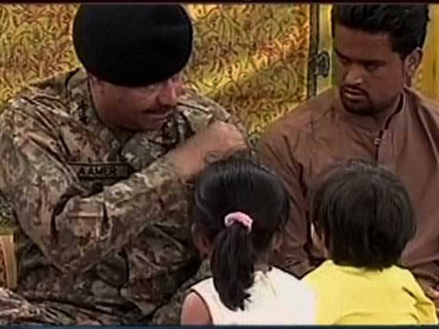 کوئٹہ: کمانڈر سدرن کمانڈ لیفٹیننٹ جنرل عامر ریاض نے کوئٹہ دھماکے میں شہید نجی ٹی وی چینل کے کیمرہ مین شہزاد خان کے بچوں کو اپنے یونیفارم پر لگا قومی پرچم ہٹا کر تحفے میں دے دیا۔