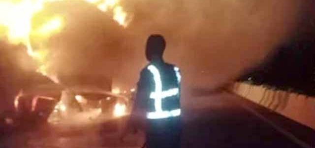 موٹروے ایم 5 پر بہاولپور کے قریب لاہور سے کراچی آنے والی سلیپر بس میں ٹینکر سے تصادم کے بعد آگ لگ گئی۔